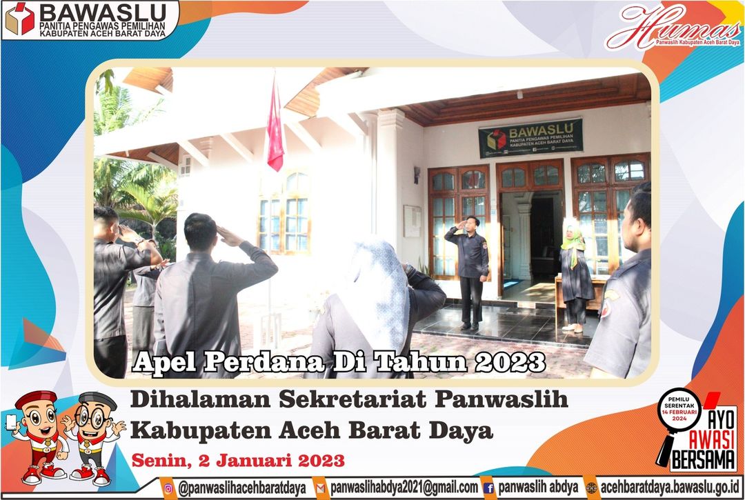 Blangpidie, Panwaslih Kabupaten Aceh Barat Daya melaksanakan apel perdana di tahun 2023, yang di ikuti oleh seluruh jajaran sekretariat untuk menjadikan momentum tahun baru untuk menguatkan semangat kerja dalam menjalankan tugas pengawasan tahapan Pemilu Tahun 2024, Senin (02/01/2023).