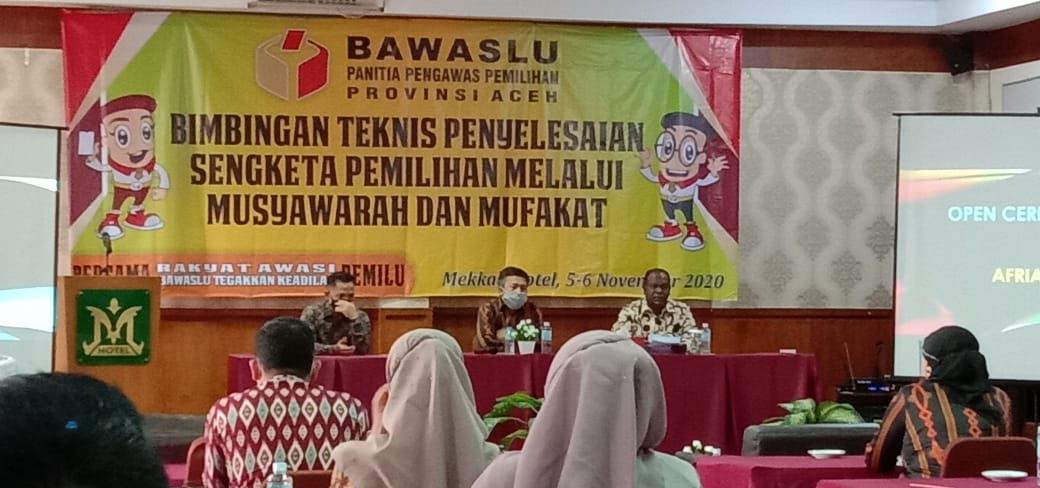 Banda Aceh, Panwaslih Kabupaten Aceh Barat Daya mengikuti undangan bimbingan teknis dalam rangka peningkatan keterampilan Penyelesaian Sengketa Proses Pemilihan melalui musyawarah dan mufakat yang diselenggarakan oleh Panwaslih Provinsi Aceh di Hotel Mekkah Banda Aceh berlangsung selama 2 hari pada hari kamis-jumat (5-6/11/2020).