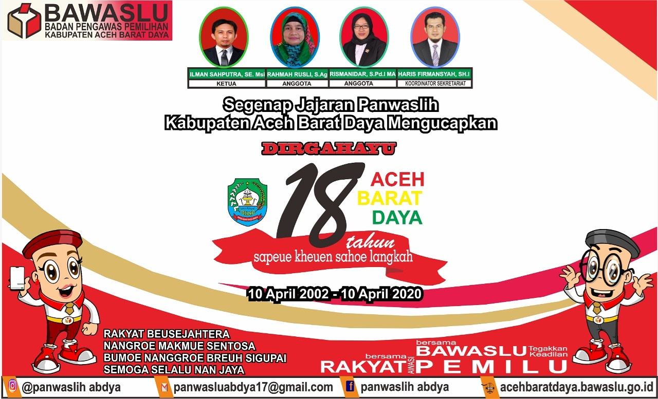 Aceh Barat Daya- Segenap Jajaran Panwaslih Kabupaten Aceh Barat Daya mengucapkan Dirgahayu yang ke-18 tahun di Bumoe Nanggroe Breuh Sigupai, pada hari Jumat (10 April 2020). Perayaan HUT Abdya tahun ini jauh sangat berbeda dari tahun-tahun sebelumnya, karena pada tahun ini banyaknya penyebaran Covid-19 yang telah menyebar di seluruh indonesia termasuk Kabupaten Aceh Barat Daya.