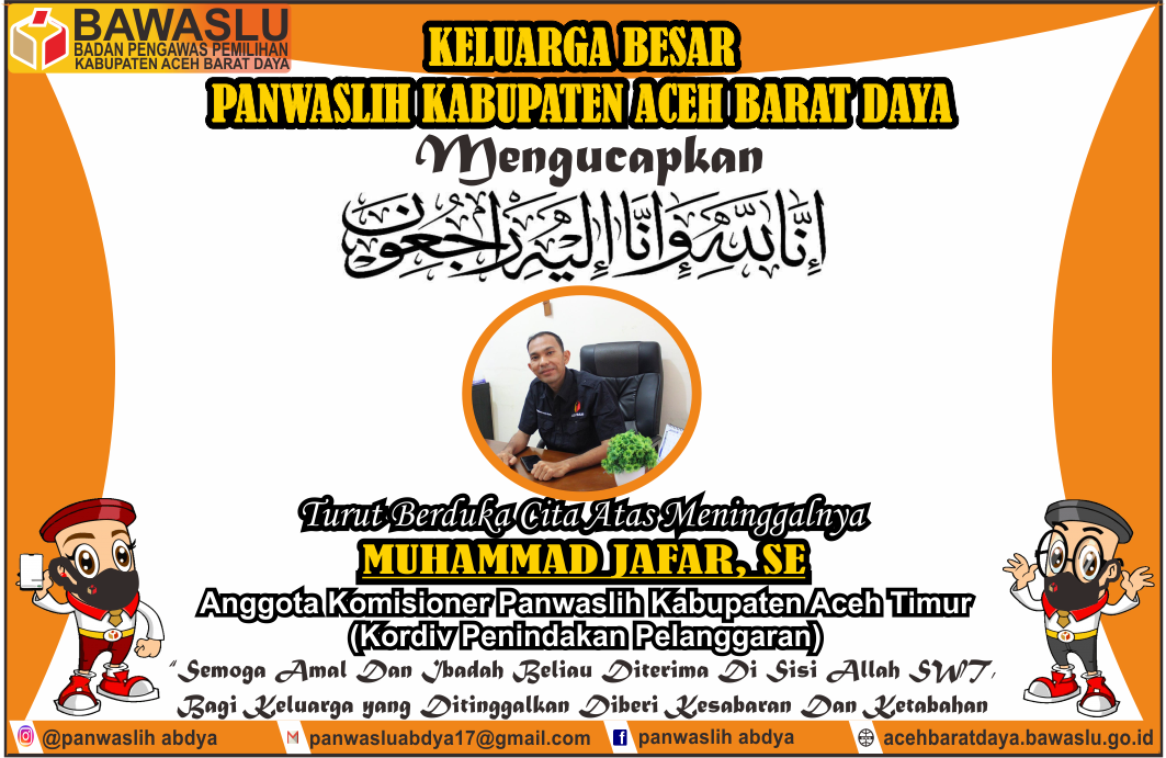 Aceh Barat Daya, Keluarga Besar Panitia Pengawas Pemilihan (Panwaslih) Kabupaten Aceh Barat Daya Mengucapkan Innalillahi Wainnailahi Raji’un, Turut Berduka Cita Atas Meninggalnya MUHAMMAD JAFAR, SE Sebagai Anggota Komisioner Panwaslih Kabupaten Aceh Timur (Koordinator Divisi Penindakan Pelanggaran) pada hari ini Rabu, 09 September 2020, tadi Shubuh di Rumah Sakit Graha Bunda Idi Rayeuk.