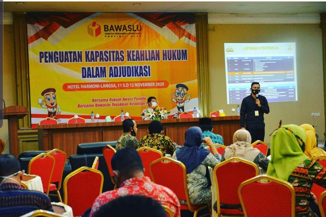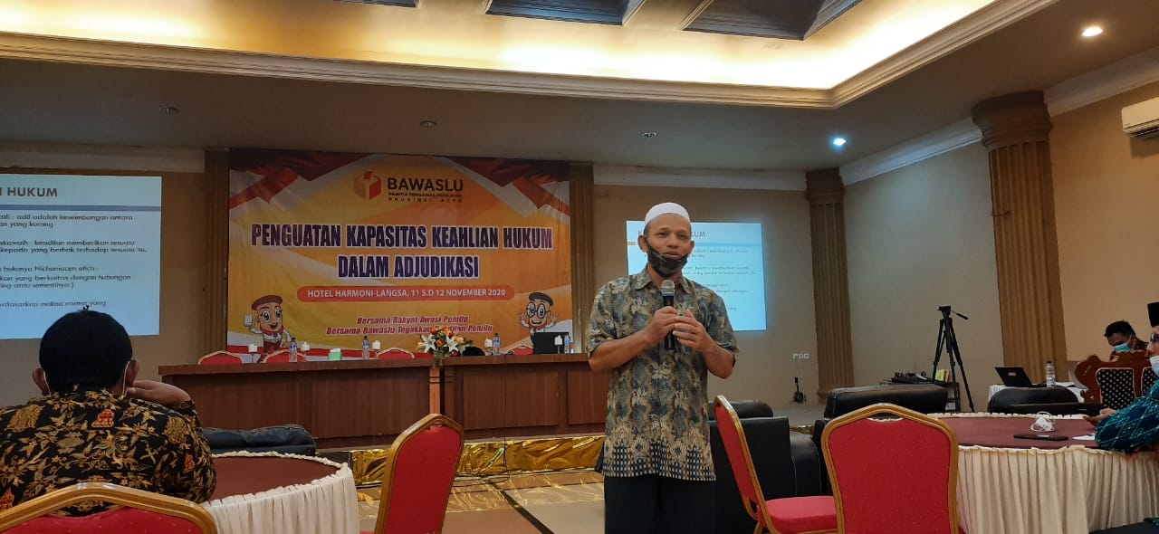 Faizah sebagai Ketua Panwaslih Provinsi Aceh menyampaikan dalam sambutannya bahwa Bawaslu memiliki kewenangan untuk menerima laporan, kemudian memeriksa dan memutuskan, yang membuat Bawaslu memiliki peran sebagai penyidik, penuntut juga sebagai hakim. Oleh karenanya kami berharap bahwa proses Penguatan Kapasitas Keahlian Hukum dalam Adjudikasi ini dapat kita manfaatkan dengan baik.
