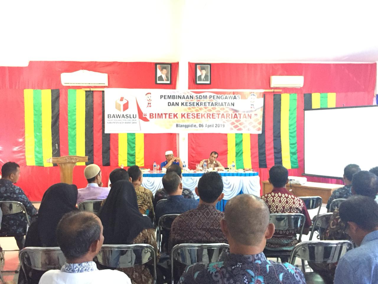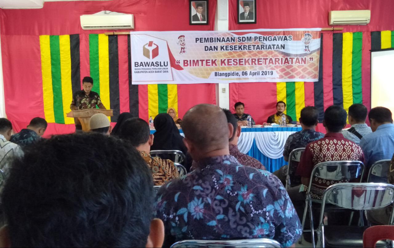 Blangpidie - Dalam rangka meningkatkan Sumber Daya Manusia dan Pengawasan, Panitia Pengawas Pemilihan (Panwaslih) Kabupaten Aceh Barat Daya mengadakan Bimbingan Teknis Kesekretariatan untuk semua staf Panitia Pengawas Pemilihan Kecamatan (Panwascam), Sabtu (7/4/19).