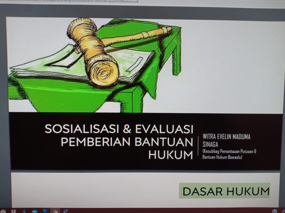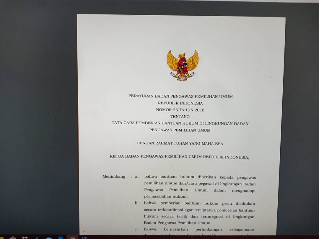 "Dasar bantuan hukum di lembaga pengawas pemilu tertuang dalam UU Nomor 7 Tahun 2017 tentang Penyelenggara Pemilihan Umum, Perpres Nomor 68 Tahun 2018 tentang Kedudukan, Tugas, Fungsi, Wewenang, Organisasi Dan Tata Kerja Sekretariat Jenderal Bawaslu, Sekretariat Bawaslu Provinsi Dan Sekretariat Badan Pengawas Pemilihan Umum Kabupaten/Kota, Peraturan Bawaslu Nomor 26 Tahun 2018 tentang Tata Cara Pemberian Bantuan Hukum di Lingkungan Bawaslu dan Perbawaslu Nomor 7 Tahun 2019 Tentang Organisasi Dan Tata Kerja Sekretariat Jenderal Badan Pengawas Pemilihan Umum, Sekretariat Badan Pengawas Pemilihan Umum Provinsi, Sekretariat Badan Pengawas Pemilihan Umum Kabupaten/Kota, Dan Sekretariat Panitia Pengawas Pemilihan Umum Kecamatan", tuturnya.