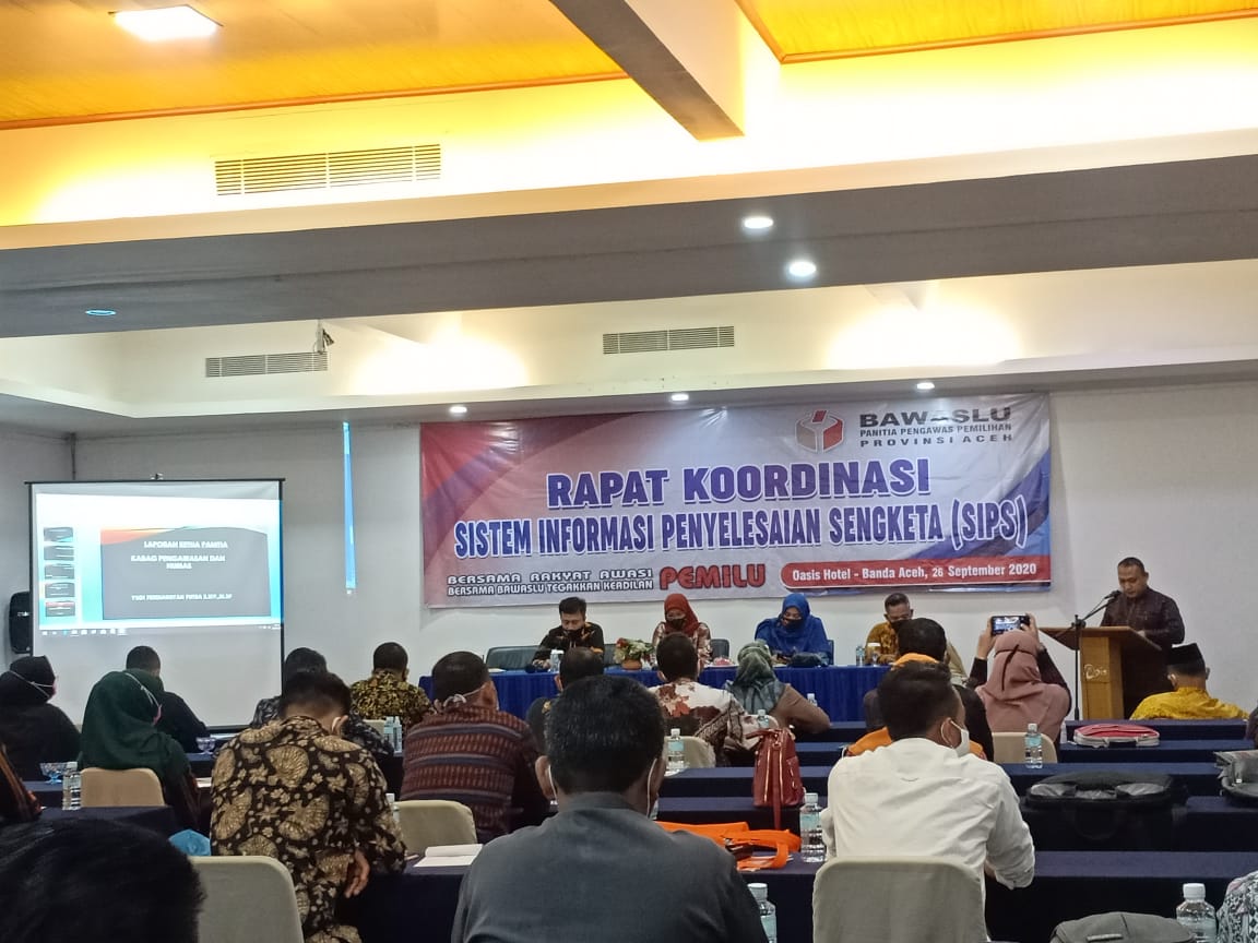 Aceh Barat Daya, Panitia Pengawas Pemilihan Kabupaten Aceh Barat Daya menghadiri dalam rangka pengoptimalisasian penggunaan APlikasi Sistem Informasi Penyelesaian Sengketa (SIPS) pada jajaran Panwaslih Kabupaten/Kota Se Aceh yang di selenggarakan oleh Panwaslih Provinsi Aceh di tempat Aula Hotel Oasis Banda Aceh pada hari Sabtu (26/09/2020).