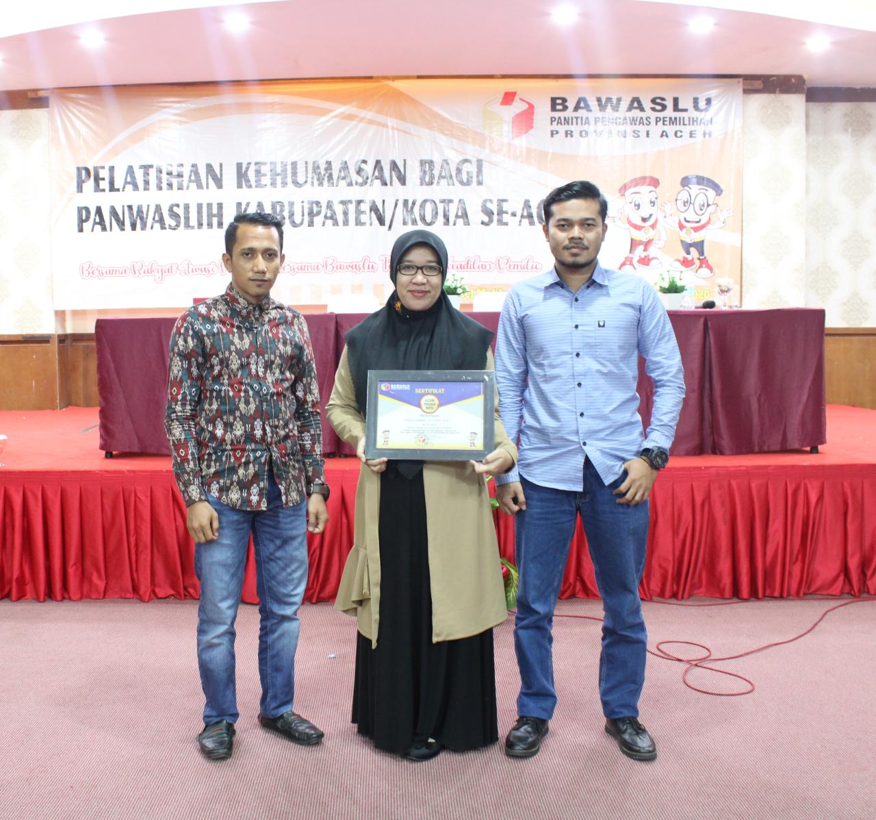 Penyerahan sertifikat sebagai kategori penulisan berita terbaik ini diserahkan langsung oleh Ibu Marini sebagai Koordinator Divisi Pengawasan dan Hubal Panwaslih Provinsi Aceh kepada Ibu Rismanidar sebagai Koordinator Divisi Pengawasan, Hubungan Masyarakat dan Hubungan Lembaga Panwaslih Kabupaten Aceh Barat Daya yang turut di dampingi oleh 2 orang staf (M. Muliadi dan Hasbi Iswanto) Panwaslih Kabupaten Aceh Barat Daya.