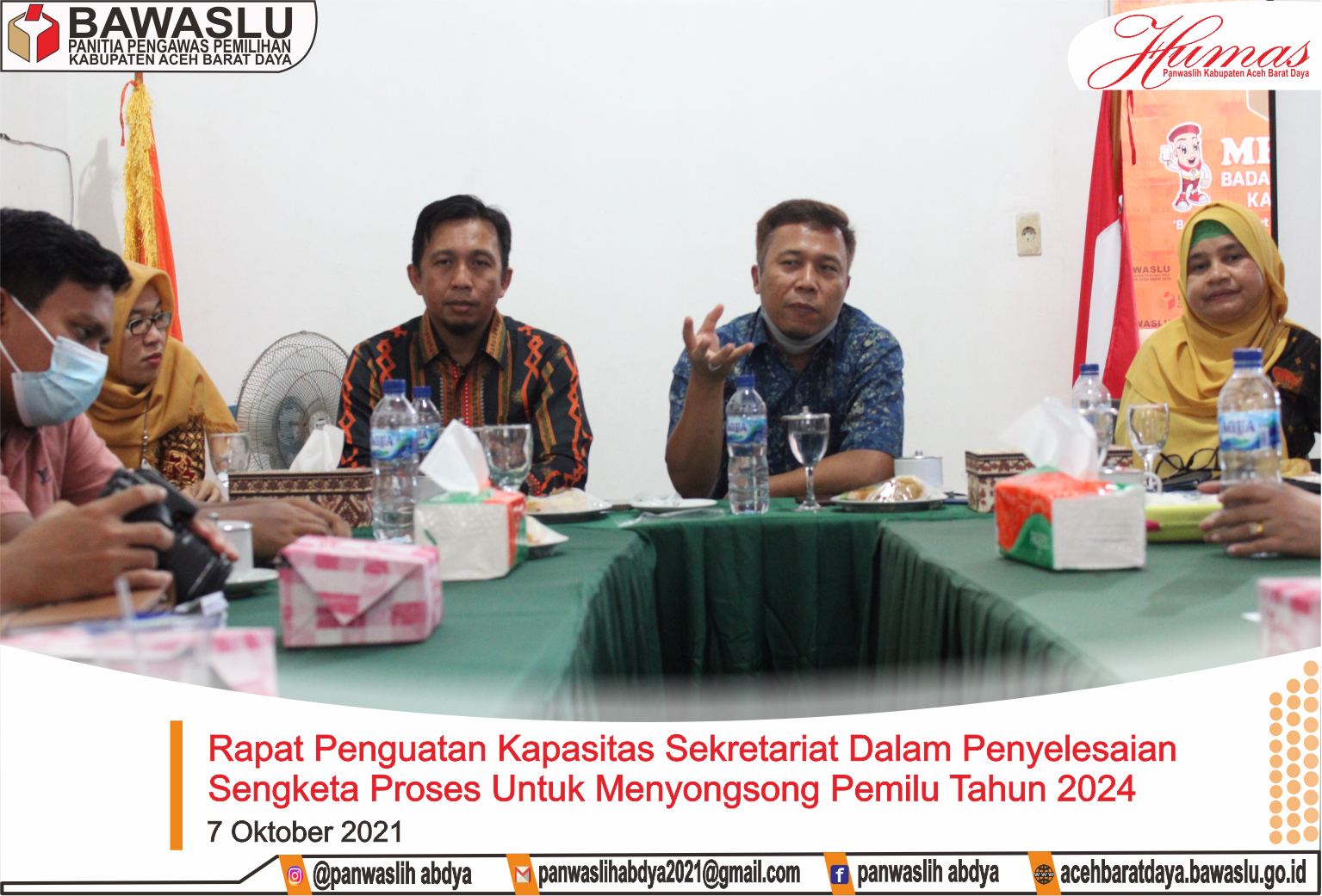 Aceh Barat Daya, Panitia Pengawas Pemilihan Kabupaten Aceh Barat Daya melakukan peningkatan kapasitas penanganan dan penyelesaian sengketa pemilu dan pilkada menyongsong Pemilu 2024, hal ini bertujuan untuk peningkatan kapasitas staf Panwaslih Abdya dalam hal menerima laporan penyelesaian sengketa proses pemilu dan menangani proses penyelesaian sengketa secara maksimal sesuai dengan peraturan yang telah di tetapkan.