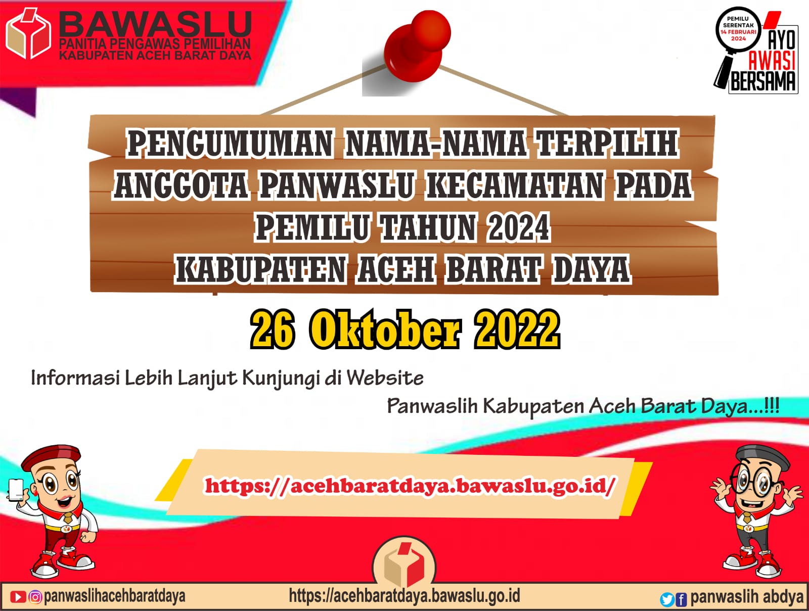 Bahwa Setelah Panwaslih Kabupaten Aceh Barat Daya melakukan rapat pleno penetapan nama-nama Panwaslu Kecamatan terpilih pada tanggal 24 Oktober 2022 pukul 16.30 maka Pokja Pembentukan Panwaslu Kecamatan Kabupaten Aceh Barat Daya Hari ini tanggal 26 Oktober 2022. Secara resmi mengumumkan nama-nama Panwaslu Kecamatan terpilih, Unduh Link di bawah ini: