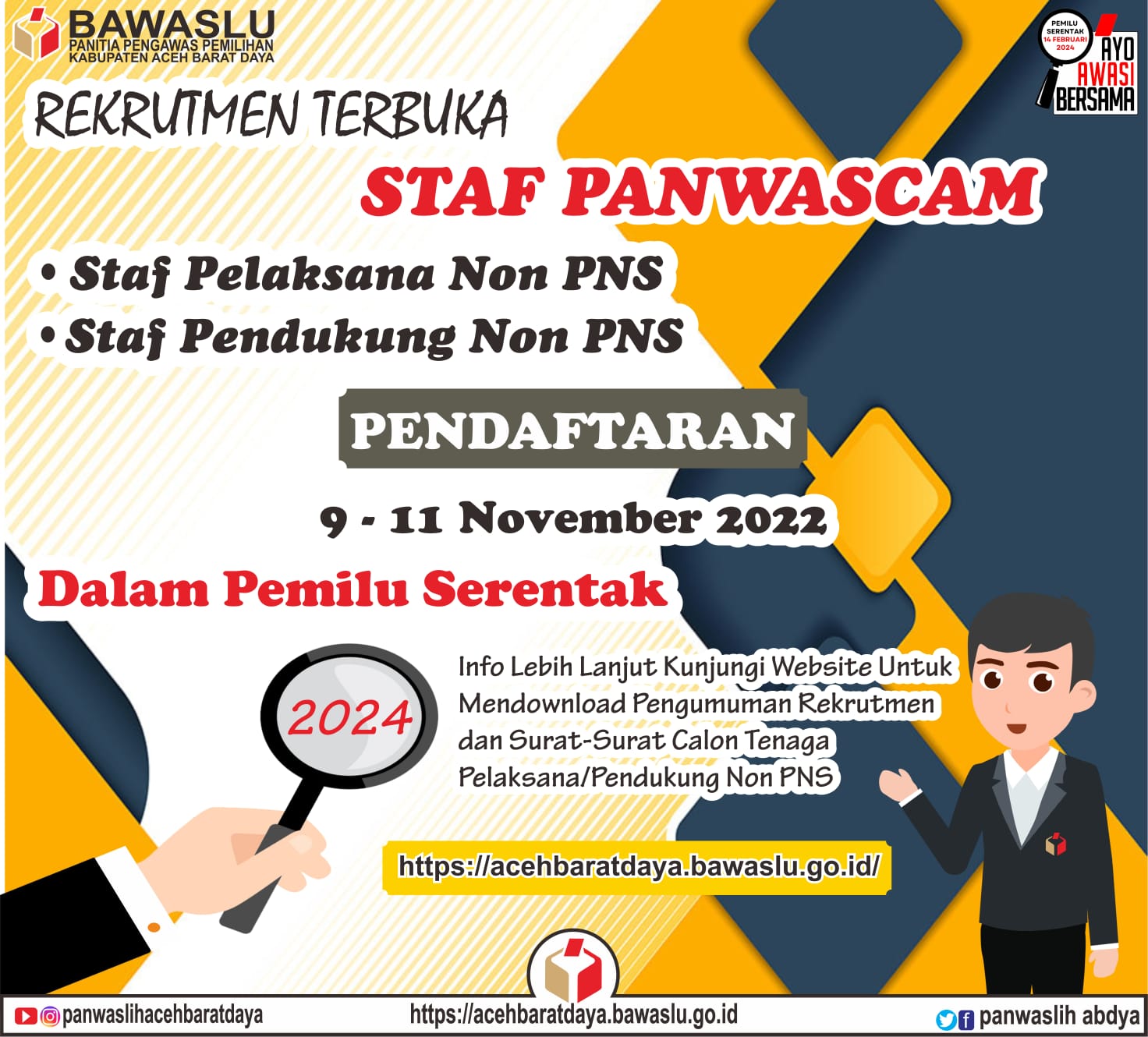 Sehubungan hal tersebut di atas bahwa Panitia Pengawas Pemilihan Kabupaten Aceh Barat Daya Menerima Pendaftaran bagi Calon Tenaga Pelaksana Non PNS dan Tenaga Pendukung Non PNS pada Sekretariat Panwaslu Kecamatan Se-Kabupaten Aceh Barat Daya dalam rangka Pemilu serentak Tahun 2024