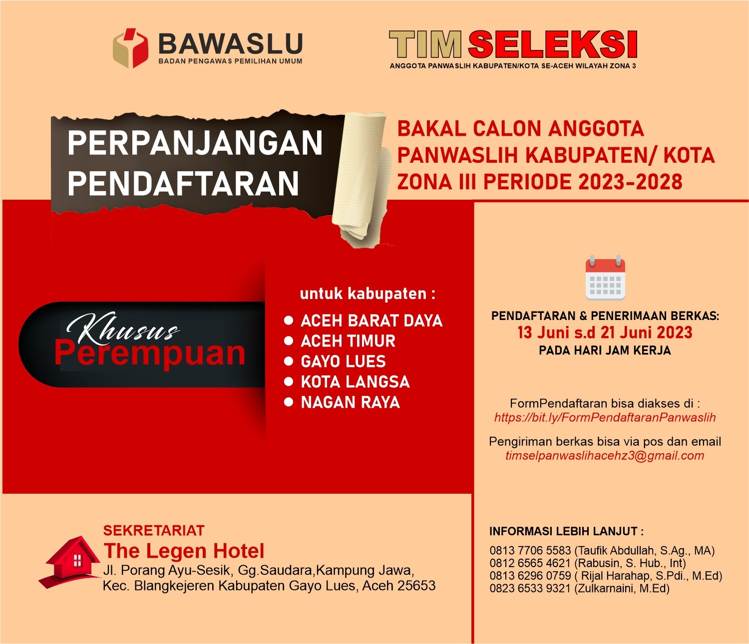 Blangpidie, Dalam rangka pembentukan Panwaslih Kabupaten Aceh Barat Daya, Aceh Tamiang, Aceh Timur, Gayo Lues, Nagan Raya, dan Kota Langsa maka Tim Seleksi Calon Anggota Panwaslih Kabupaten Aceh Barat Daya, Aceh Tamiang, Aceh Timur, Gayo Lues, Nagan Raya, dan Kota Langsa, berdasarkan Keputusan Bawaslu Nomor: 176/HK.01.01/K1/05/2023 atas kewenangan yang diberikan oleh Undang – Undang Nomor 7 Tahun 2017 tentang Pemilihan Umum membuka kesempatan bagi Warga Negara Indonesia yang memenuhi persyaratan untuk mendaftarkan diri sebagai calon anggota Panwaslih Kabupaten Aceh Barat Daya, Aceh Tamiang, Aceh Timur, Gayo Lues, Nagan Raya, dan Kota Langsa. Adapun ketentuan perpanjangan pendaftaran bagi perempuan khusus Kabupaten berdasarkan Nomor : 007/TimselPanwaslih/Aceh-03/06/2023 tentang Perpanjangan Pendaftaran Calon Perempuan Anggota Panwaslih Kab. Abdya, Aceh Timur, Gayo Lues, Nagan Raya Dan Langsa Zona III Panwaslih Aceh sebagai berikut: