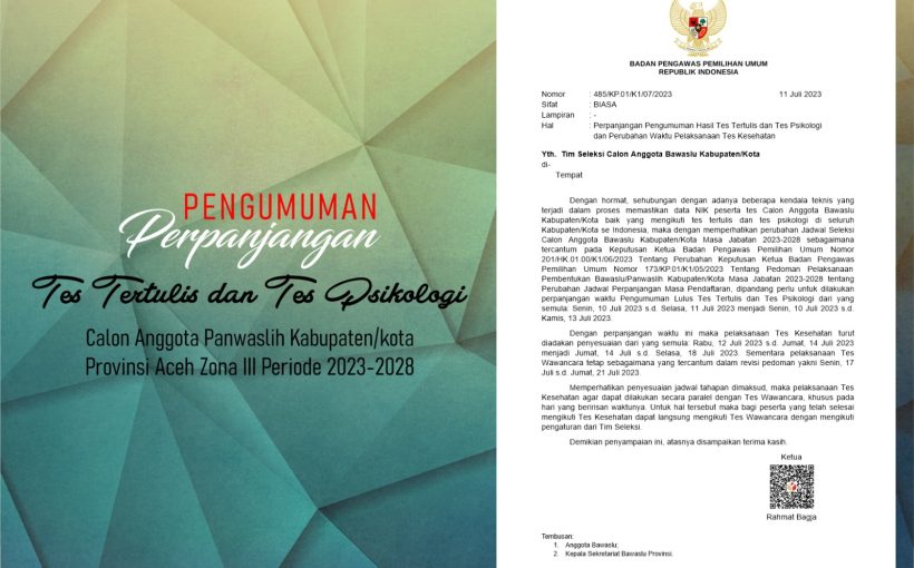Berdasarkan dengan surat Bawaslu RI Nomor 485/KP.01/K1/07/2023 tanggal 11 Juli 2023 tentang Perpanjangan Pengumuman Hasil Tes Tertulis dan Tes Psikologi dan Perubahan Waktu Pelaksanaan Tes Kesehatan. sehubungan dengan adanya beberapa kendala teknis yang terjadi dalam proses memastikan data NIK peserta tes Calon Anggota Bawaslu Kabupaten/Kota baik yang mengikuti tes tertulis dan tes psikologi di seluruh Kabupaten/Kota se Indonesia, maka dengan memperhatikan perubahan Jadwal Seleksi Calon Anggota Bawaslu Kabupaten/Kota Masa Jabatan 2023-2028 sebagaimana tercantum pada Keputusan Ketua Badan Pengawas Pemilihan Umum Nomor 201/HK.01.00/K1/06/2023 Tentang Perubahan Keputusan Ketua Badan Pengawas Pemilihan Umum Nomor 173/KP.01/K1/05/2023 Tentang Pedoman Pelaksanaan Pembentukan Bawaslu/Panwaslih Kabupaten/Kota Masa Jabatan 2023-2028 tentang Perubahan Jadwal Perpanjangan Masa Pendaftaran, dipandang perlu untuk dilakukan perpanjangan waktu Pengumuman Lulus Tes Tertulis dan Tes Psikologi dari yang semula Senin, 10 Juli 2023 s.d. Selasa, 11 Juli 2023 menjadi Senin, 10 Juli 2023 s.d. Kamis, 13 Juli 2023.