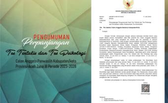 Berdasarkan dengan surat Bawaslu RI Nomor 485/KP.01/K1/07/2023 tanggal 11 Juli 2023 tentang Perpanjangan Pengumuman Hasil Tes Tertulis dan Tes Psikologi dan Perubahan Waktu Pelaksanaan Tes Kesehatan.