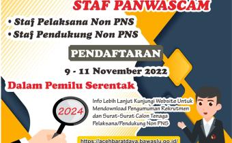 Berdasarkan Keputusan Ketua Bawaslu Nomor : 054 /HK.01/K1/10/202 tentang Perubahan Keputusan Ketua Bawaslu Nomor : 314/HK.01.00/k1/09/2022 tentang Pedoman Pelaksana Pembentukan Panitia Pengawas Pemilu Kecamatan Dalam Rangka Pemilu Serentak Tahun 2024, dijelaskan bahwa Pegawai Se